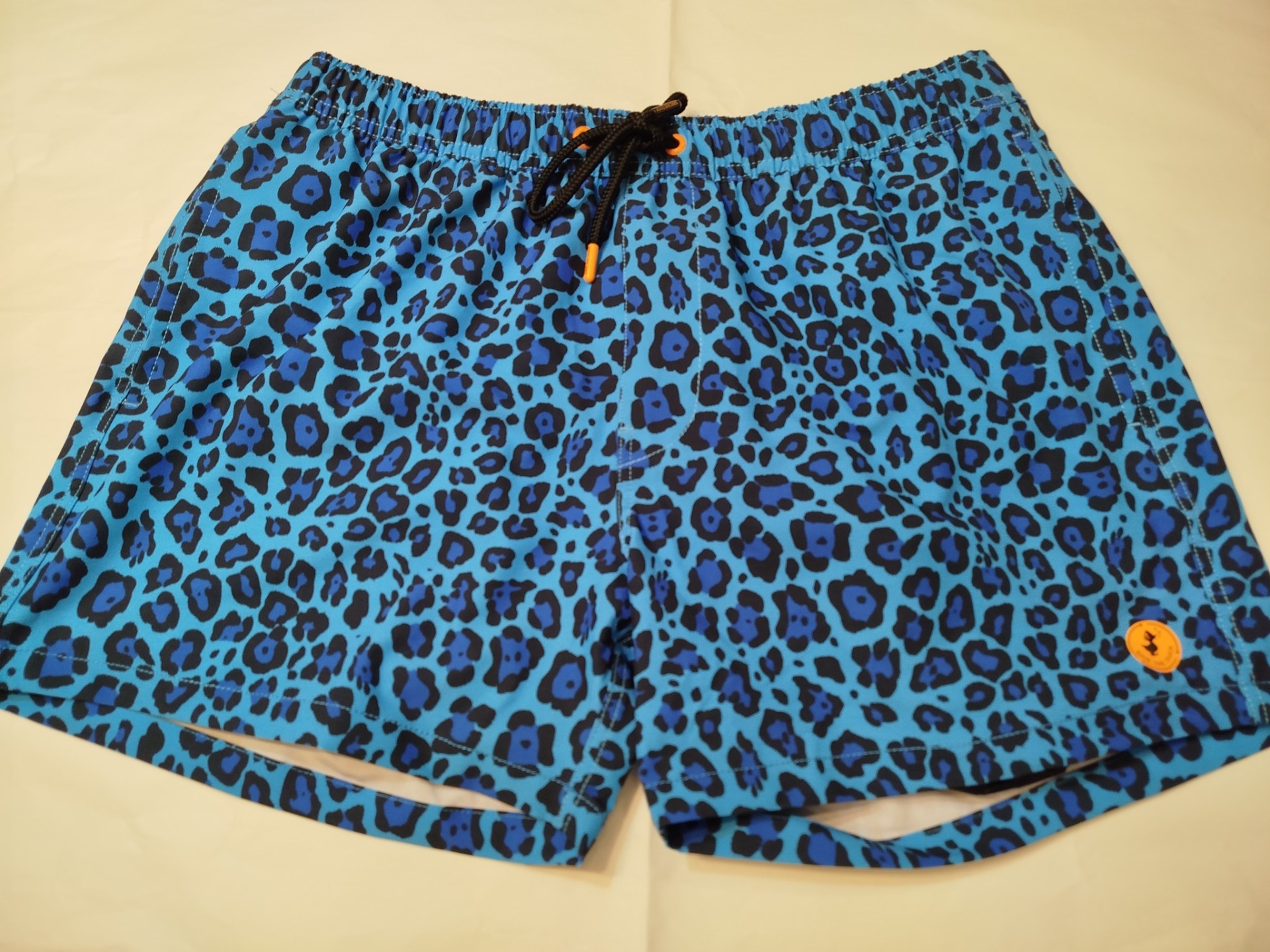 Bañador 100% poliester de la casa Save the duck en tonos azules y efecto leopardo como se aprecia en la imagen