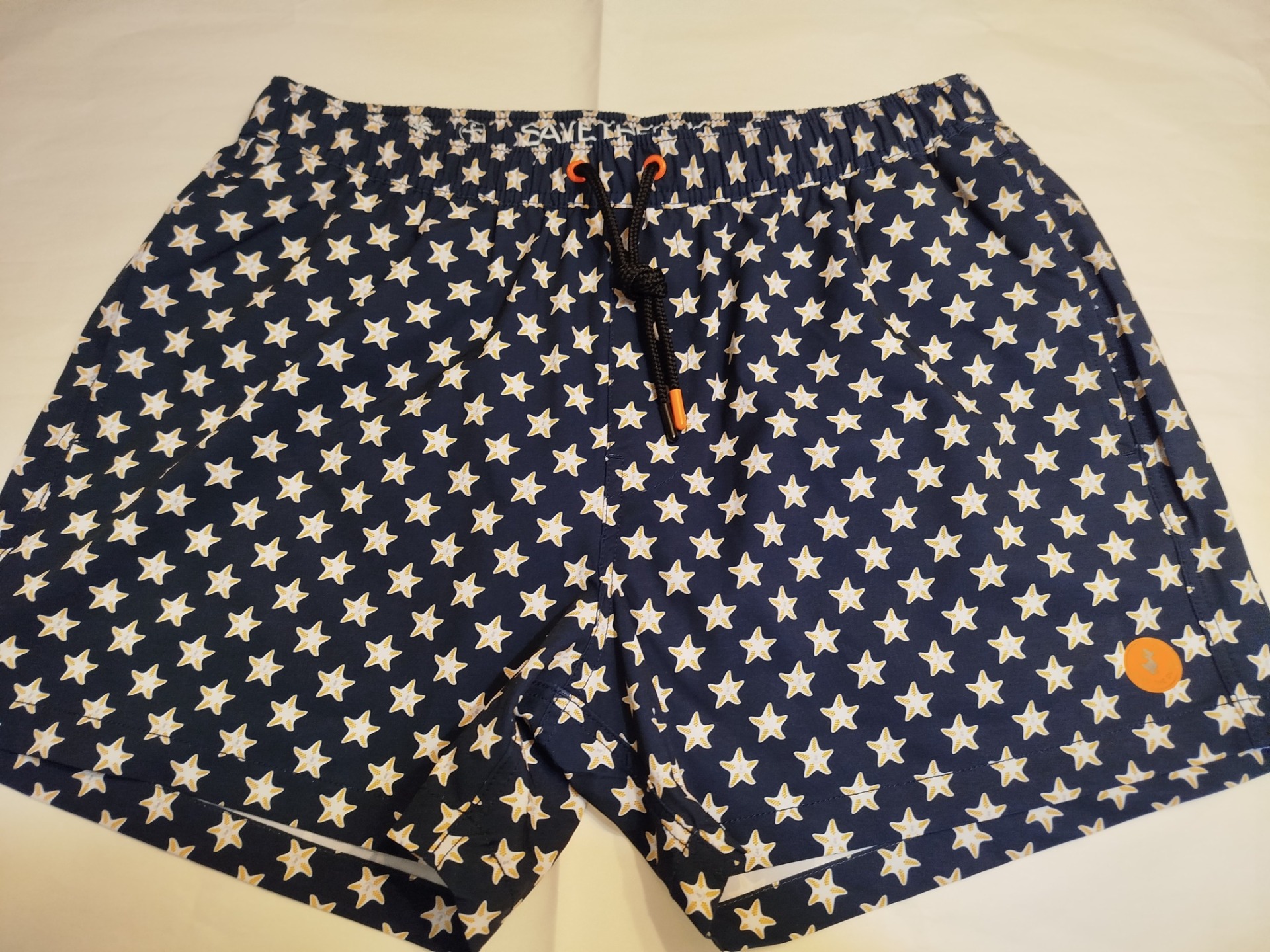 Bañador 100% poliester de la casa Save the duck en azul oscuro con estrellas en blanco como se aprecia en la imagen