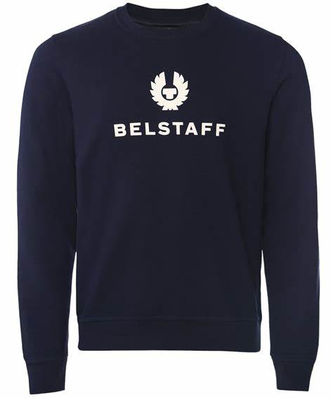 Sudadera de felpa 100% algodón en color azul oscuro de la casa Belstaff con detalle del logo en goma en blanco